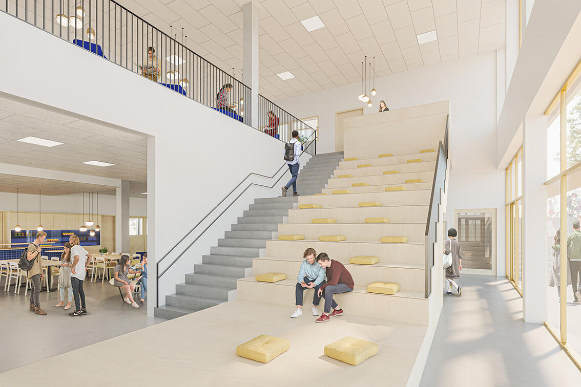 “The ground floor is conceived as a large, open learning plaza with a foyer and a double-height atrium that links to the first floor. The secretariat, kitchen and a brand-new laboratory will be arranged around the foyer. The first floor will be home to innovative landscape classrooms that can be flexibly adapted in terms of size by mobile furniture, among other things. The sports hall will be housed on the second floor and fitted with professional equipment.” - Gert Standaert of czaar architecten