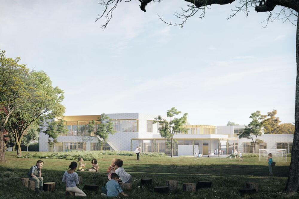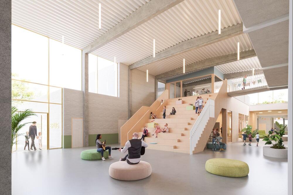« Tous les espaces sont regroupés dans un bâtiment scolaire compact, ce qui permet de dégager davantage d’espaces extérieurs. À l’intérieur, les différentes zones — comme les salles de classe ouvertes et la salle de projet — sont multifonctionnelles. Le parc scolaire vert invite à jouer ensemble dehors. Il y aura un théâtre de plein air avec gradins en bois, des espaces de cours en extérieur, et un potager en hauteur où les enfants pourront mettre la main à la pâte. Autour de l’école, des arbres d’ombrage, des buissons, de l’herbe et une noue d’infiltration offriront non seulement un cadre verdoyant, mais aussi de la fraîcheur lors des périodes chaudes. Ces éléments naturels absorberont également le bruit de la circulation et limiteront les nuisances sonores pour le voisinage. En résumé, l’environnement scolaire a été conçu pour respirer la tranquillité, la liberté et la joie de vivre — tout en étant un lieu de jeux actifs » - Sarah Flebus, HASA architecten