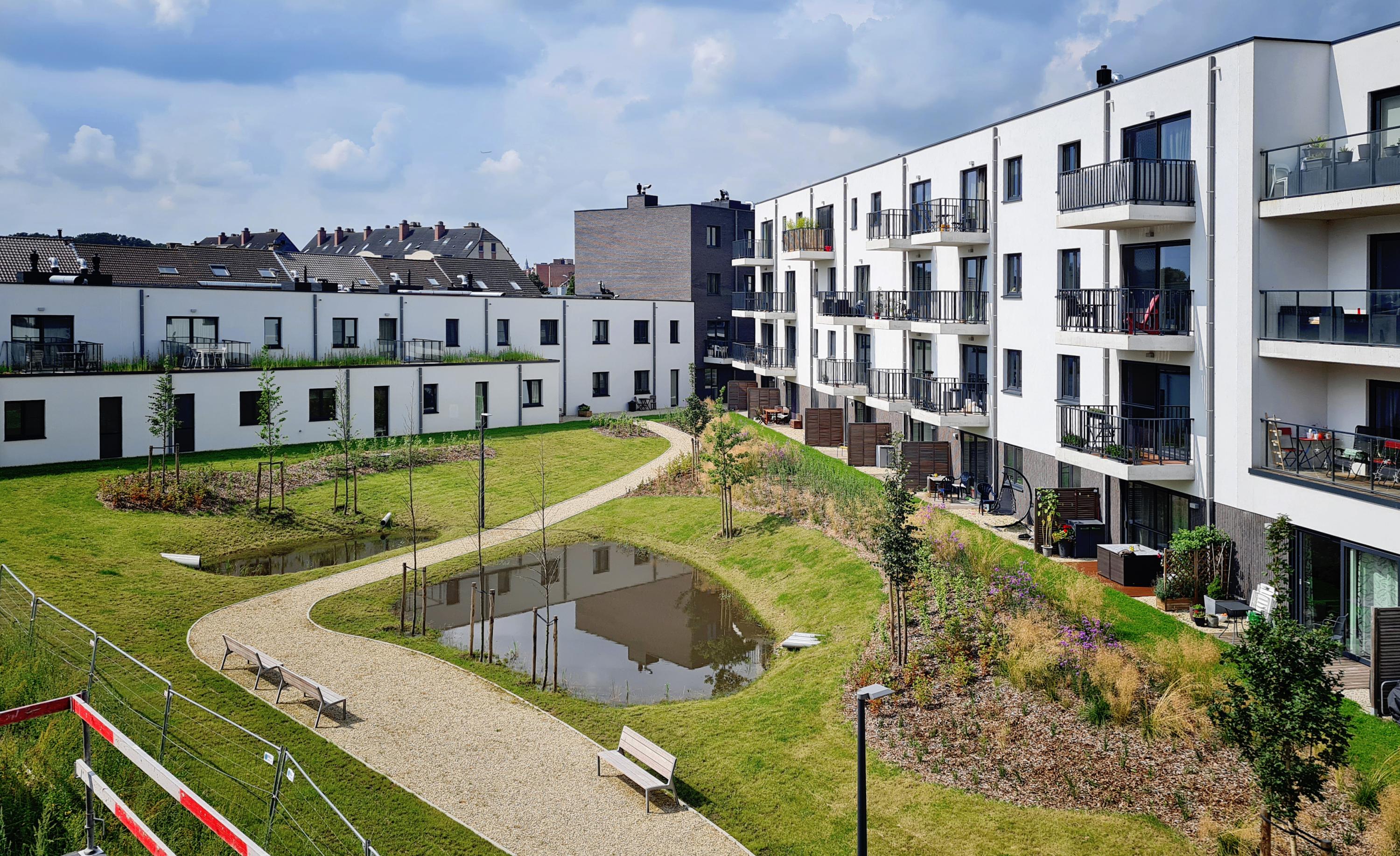 Tussen de drie gebouwen realiseerden we een privatieve parkzone met centraal een wadi. Deze eyecatcher vangt het hemelwater op en laat het infiltreren in de ondergrond. Verschillende paden laten de bewoners toe door het park te wandelen, zitten, genieten en spelen.
