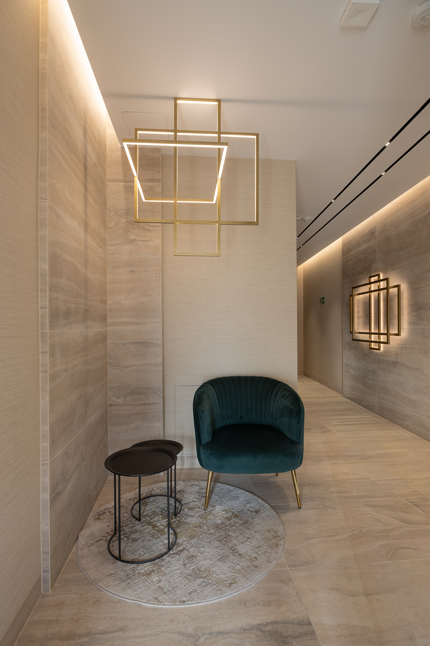 Podobną rolę pełnią zaprojektowane na zamówienie elementy sztuki użytkowej jak ręcznie robione drzwi, designerskie żyrandole czy też dywany z powtarzającym się monogramem inwestycji.
