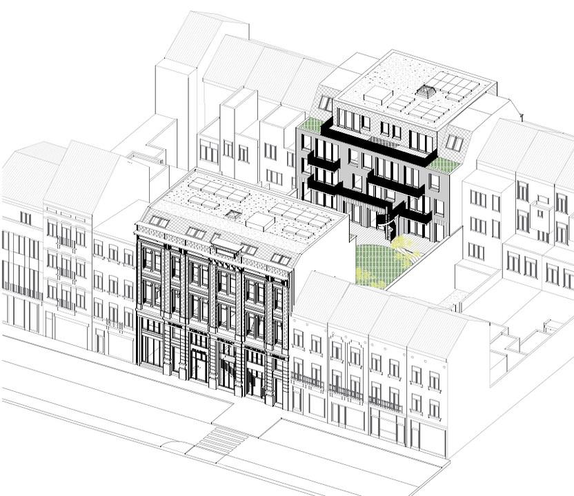 Commissioned by Entapro (Urbani), Democo is converting an old office building with a historic facade into a beautiful co-housing building with a shop, parking and 23 passive apartments with high-quality architecture, designed by Générale.